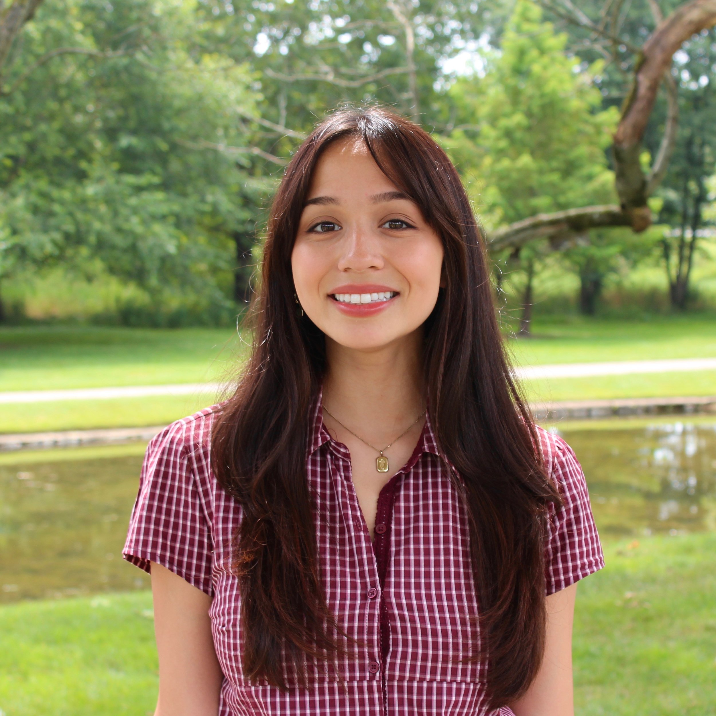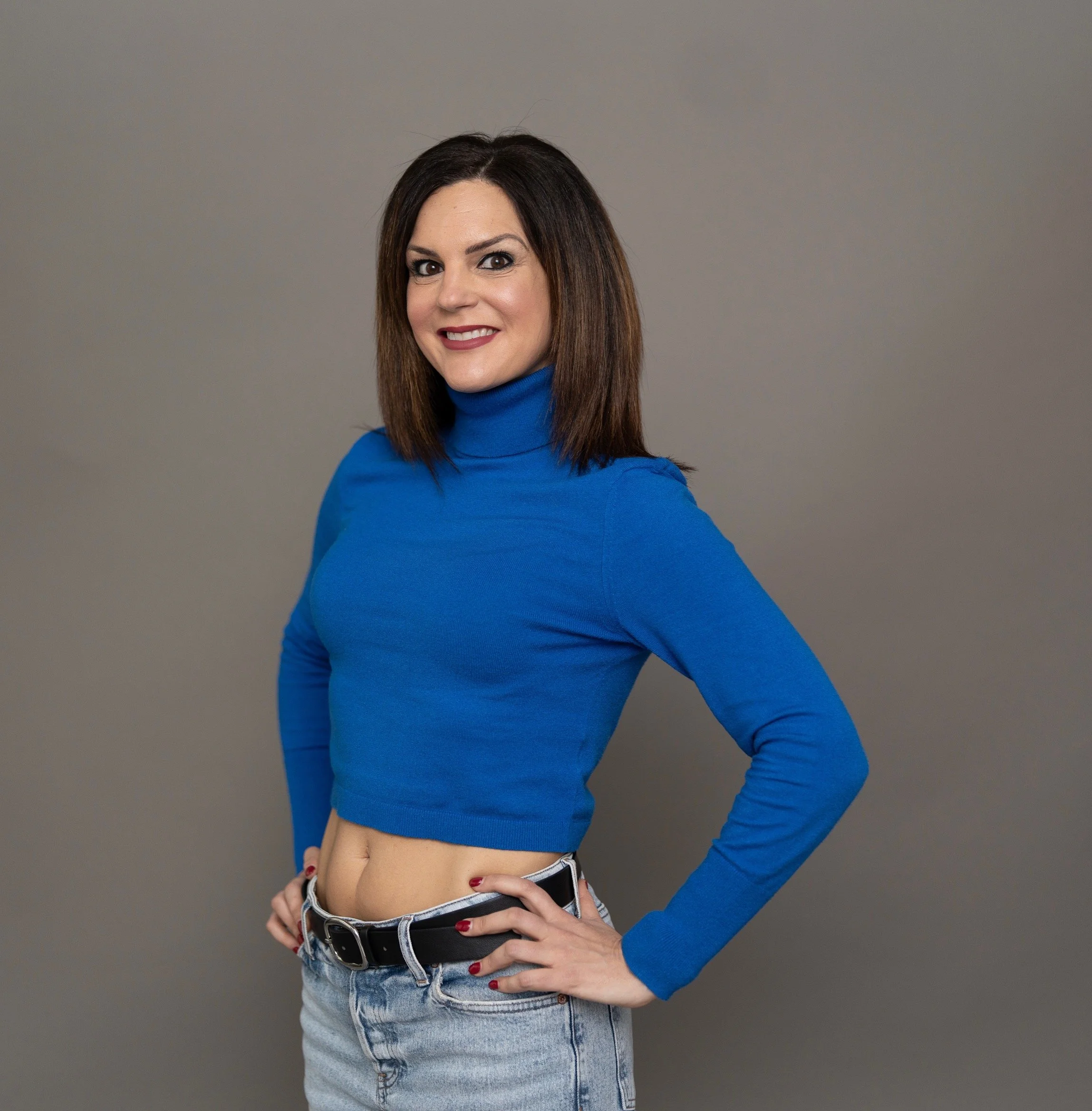 Woman with long black hair smiling, wearing a red sweater, sitting on a black chair against a dark blue curtain background.