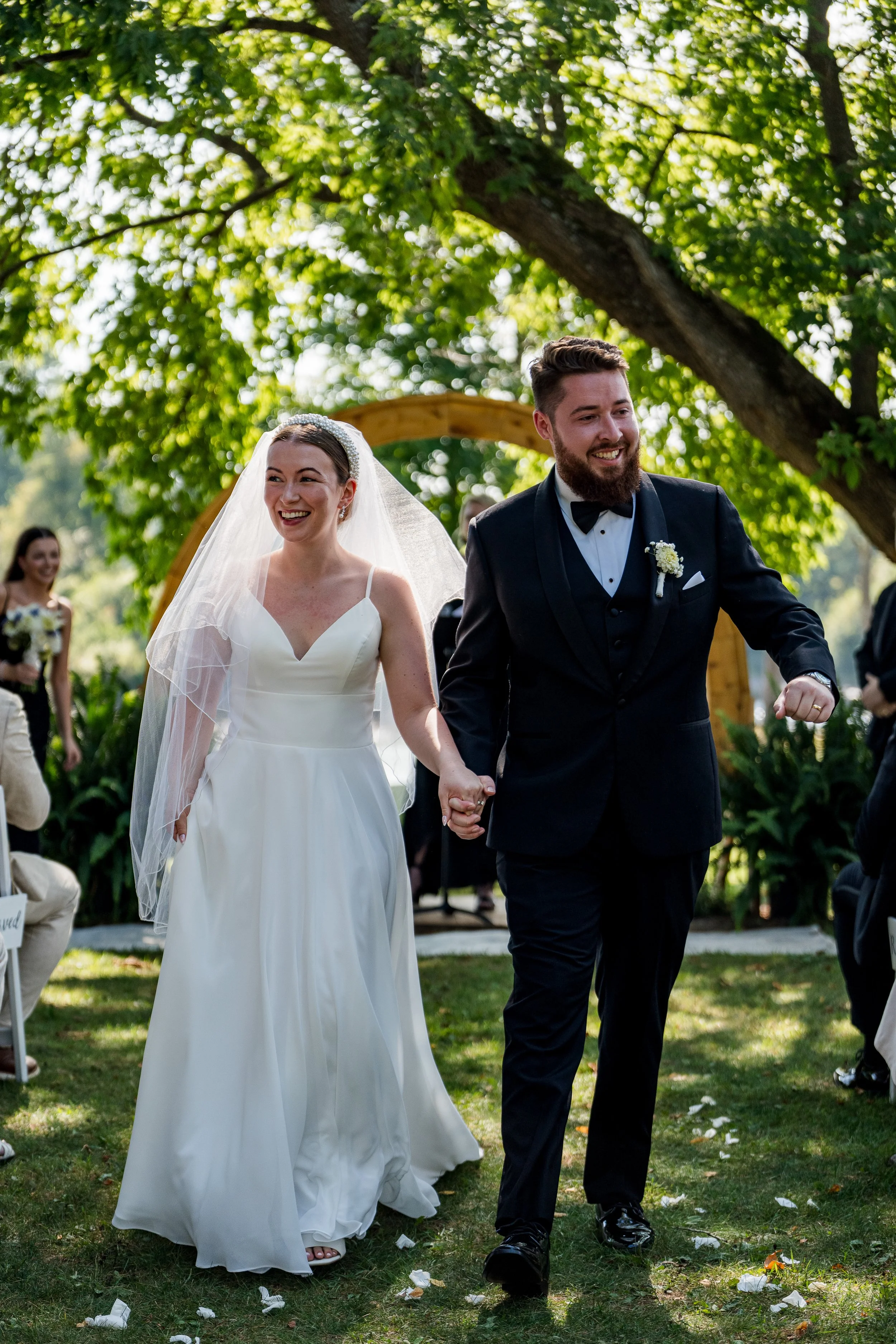 Couple getting married outdoors on marble stairs under a floral arch. Bridesmaids and a man in a tuxedo are present. Overcast sky with leafless trees in the background.